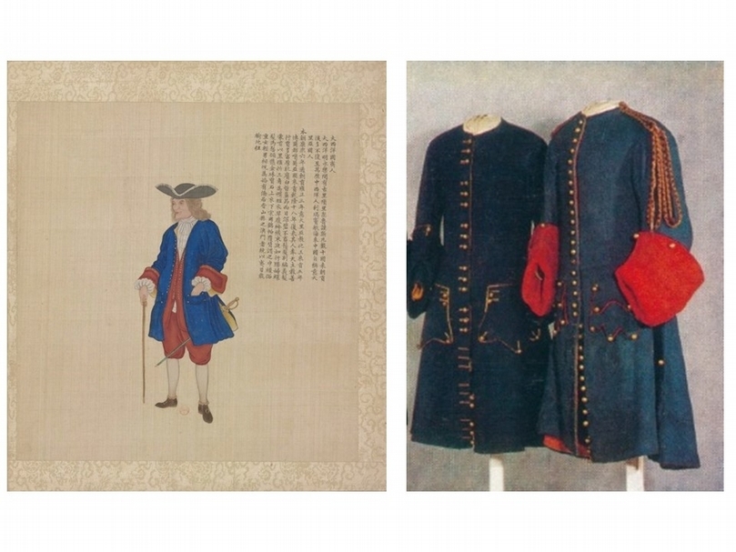 (左)《皇清職貢圖》冊頁本中的「大西洋國夷人」,法國國家圖書館藏。(© Gallica);(右)1690年代法國對襟藍色外套稱為Justaucorps,Stockholm Army博物館藏。(圖/林頎玲)