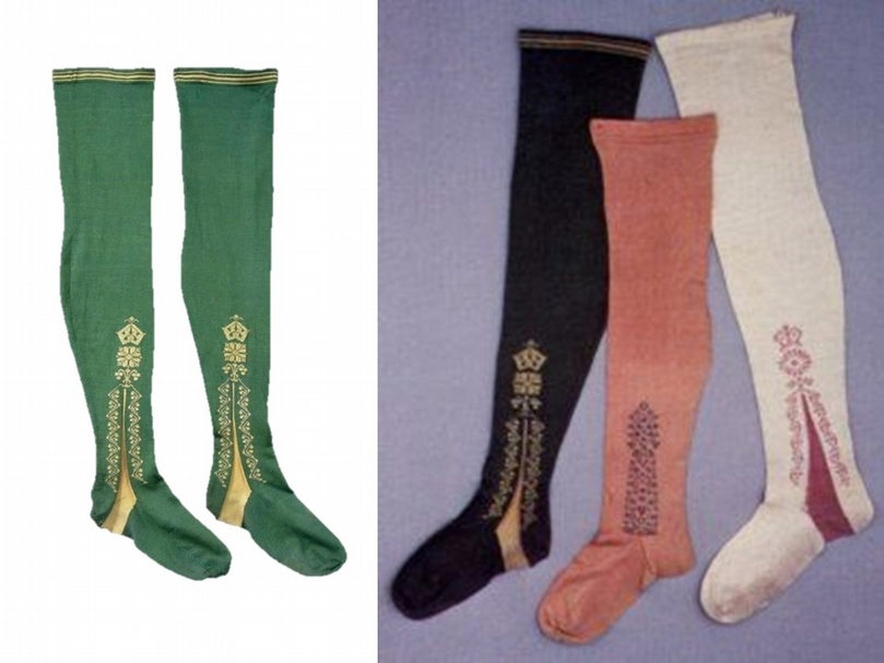 從現存的17世紀與18世紀襪子中,可看到在早期開始製作襪子時,腳踝側邊的裁片幾乎延伸至小腿,如果從圖像上看就會在小腿兩側有三角形接縫,如同《職貢圖》中合勒未祭亞男性所著襪子一般,但從18世紀中期,襪子側邊的三角形縫合點逐漸降低至腳踝,因此在圖中已看不到側邊的縫合線。另外18世紀也正是色彩長襪進入白色或淺色襪子的轉變時期,(註3)從圖中人物多穿白襪的情形看來,應屬於1700年後的穿著。