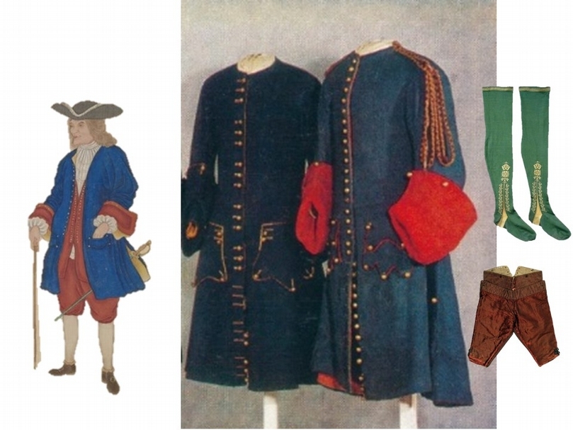 最外層穿著的對襟藍色外套稱為Justaucorps,長度略到大腿,袖口有很寬幅的反摺並點綴袖釦,裡面露出襯衣袖口的皺褶袖飾,細密的扣子從領口延伸至下擺,但穿在身上時並非完全扣起,大部分時間扣子僅作為裝飾用,因此到了17世紀晚期下半部的扣子已被省略。在1670年以後逐漸變長並縮窄成Justaucorps樣式,至18世紀以後此類型外套的形象已轉變為較接近荷蘭國男性的外套形式,長度及膝且下擺略呈弧度向後收,外輪廓顯得更為精簡俐落。(註2)在大西洋夷人圖像中所見的款式應該是17世紀末期至18世紀前期的形式,附圖為1700年代法國的Justaucorps,可看出無論是服裝形式、配色,甚至是口袋的裝飾縫法都頗為與《職貢圖》相近。