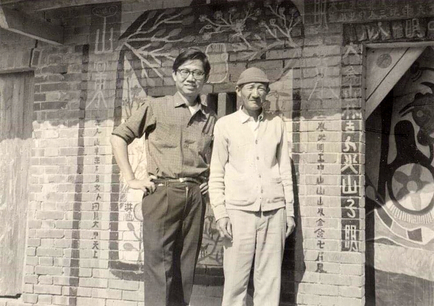 曾培堯(右)是洪通生命的貴人,攝於畫室前。(雄獅美術資料庫提供)