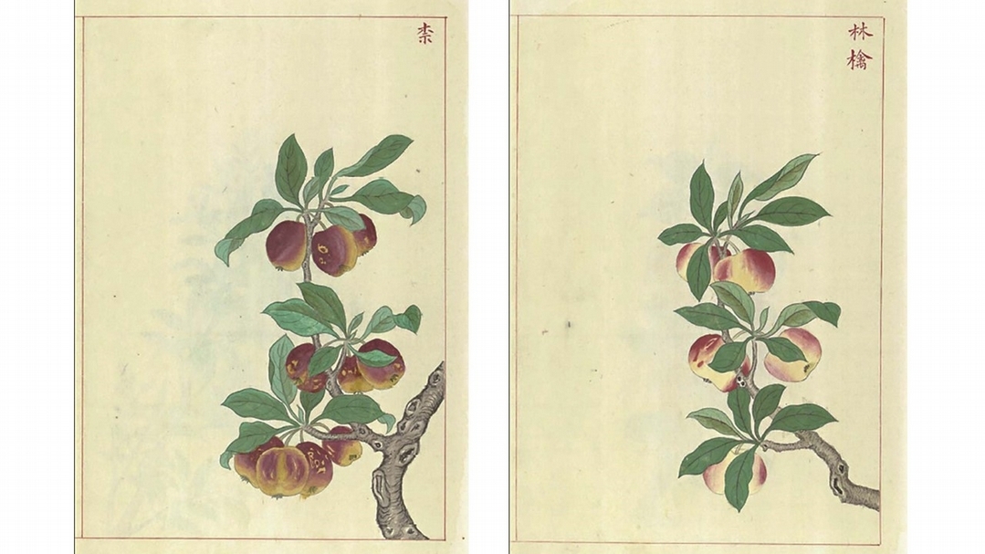 明文俶繪《金石昆蟲草木狀》,「柰」、「林禽」,明萬曆四十五至四十八年(1617-1620)彩繪本,國家圖書館藏。圖版取自書格網站。
