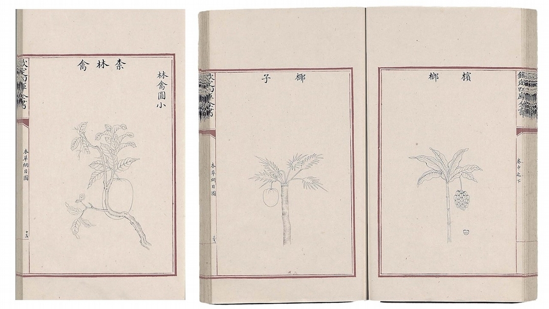 後世其他本草的插圖版本,多有增益。如晚明才女文俶(1595-1634)《金石昆蟲草木狀》,以工筆彩繪寫實手法,將柰和林檎分開描繪。文淵閣四庫全書本《本草綱目》則以白描畫出,兩者的果實枝葉比例均較為合理。有趣的是,四庫全書本的繪者似乎特別注重圖像提供辨識的作用,從其「檳榔」、「椰子」呈現完整的樹形,但同時將果實放大的畫法,可見一斑。