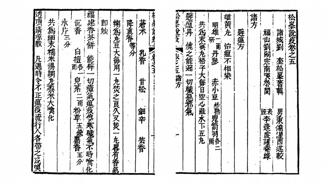 清劉奎《松峰說疫》卷五「避瘟方」,北京大學圖書館藏。圖版取自Universal Library網站。