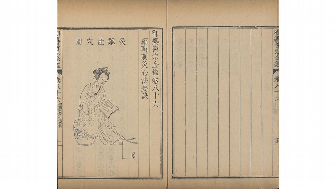 清吳謙、劉裕鐸《御纂醫宗金鑑》之「炙難產穴」,乾隆七年(1742)武英殿刊本,國立故宮博物院藏。(國立故宮博物院提供)