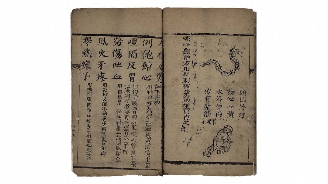 例如此處所引的「蜈蚣翻」,書中載其症狀為「頭出冷汗,擁心吐黃,水脊骨雨,旁有紫筋」,插圖上為蜈蚣蜷伏之狀,下為病人趴伏於地,擁心嘔吐,即形容人生此病,頭冒冷汗,背脊如雨,旁有紫筋,其痛苦程度猶如蜈蚣在地翻滾之狀。其治法為:「用針刺破紫筋,用雄黃點之。」有趣的是,卷末所附對於「勞傷吐血」的治療法竟是:「用自己尿一鍾加香墨二錢,調服即愈。」即現代醫學對之評價兩極的尿療法。