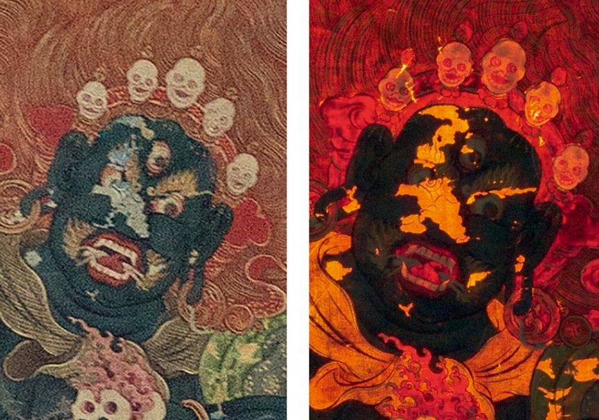 圖3-4 《吉祥天母畫像》軸唐卡透光照與原照片的局部對照。(作者提供)