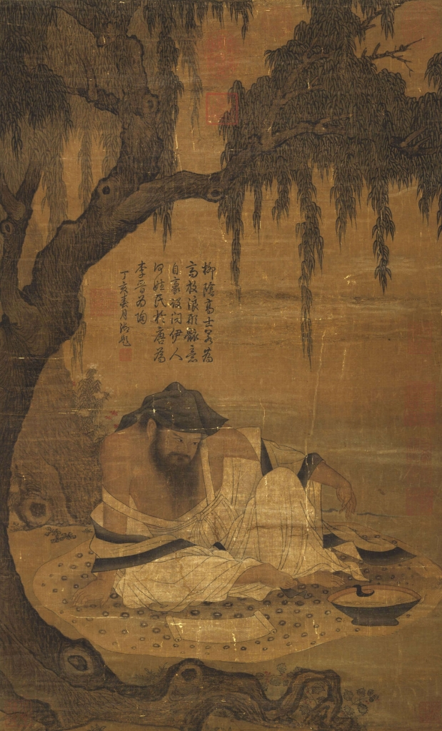 《柳陰高士圖》畫面中心,乾隆皇帝留下詩句「柳陰高士若為高。放浪形骸意自豪。設問伊人何姓氏。於唐為李晉為陶。」猜測柳陰下袒胸露腹,跣足坐於豹皮上的高士,不是李白就是陶淵明,兩位好酒的詩人之一。近代學者從陶淵明曾自況「五柳先生」,以及唐代隱士多戴「襆頭」,而非可以漉酒的葛巾等線索,確定了畫中人物並非詩仙李白,而是歸隱後的陶淵明(註1)。陶淵明對菊花的偏愛,使菊花成為隱逸居士的象徵,象徵不趨炎附勢的高潔精神。一如周敦頤〈愛蓮說〉開篇所說:「水陸草木之花,可愛者甚蕃;晉陶淵明獨愛菊。」因此,畫家描繪陶淵明時不免要加入菊花相伴,凸顯人物採菊東籬下的性格特徵。