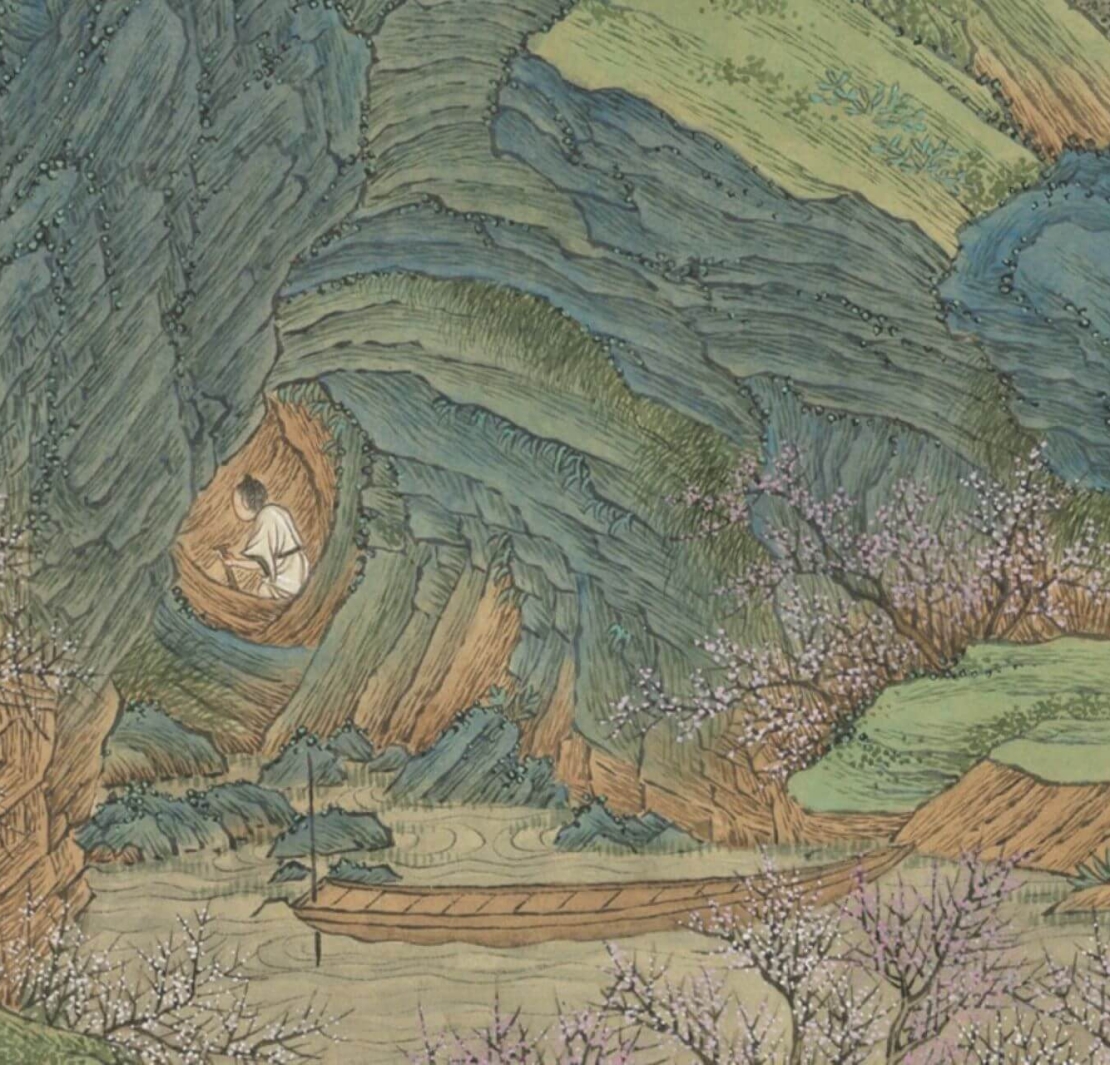 桃花林以連綿起伏的青綠山峰為背景,為後文「林盡水源,便得一山,山有小口,彷彿若有光」在水源處突然出現的山洞,鋪墊了真實畫面的合理情景。被神秘山洞吸引的漁夫,將輕舟棄置於洞口處,拿著船槳便往山洞深處走去。隨著長卷向左逐段展開,進入桃源世界之前,畫家特意安排了一段雄偉厚重的高山作為阻隔外界的分線,以此暗示「桃花源」具有與世隔絕的隱密特質。