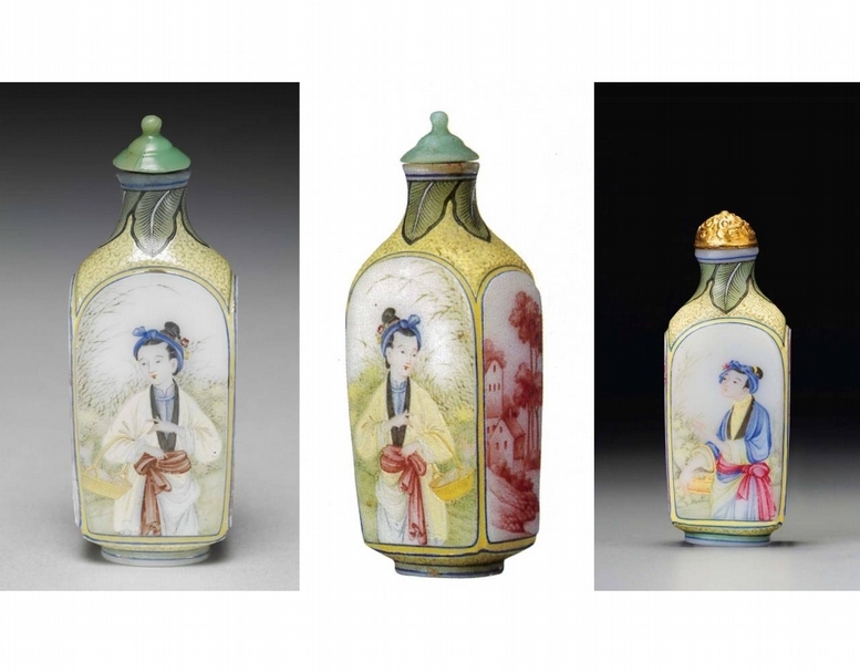 由左至右:清乾隆〈玻璃胎畫琺瑯人物鼻煙壺〉,高7公分,寬2.7公分,口徑1.2公分,國立故宮博物院藏;清乾隆〈玻璃胎畫琺瑯仕女圖鼻煙壺〉,通高7公分,腹徑2.6公分,北京故宮博物院藏;清乾隆〈御製料胎畫琺瑯仕女圖長方鼻煙壺〉,高6.2公分,香港蘇富比2015春拍「瑪麗及莊智博鼻煙壺珍藏:第十部分」,估價400萬至500萬港元,成交價716萬港元。(圖版來源:本刊資料庫、張榮主編《你應該知道的200件鼻煙壺》)