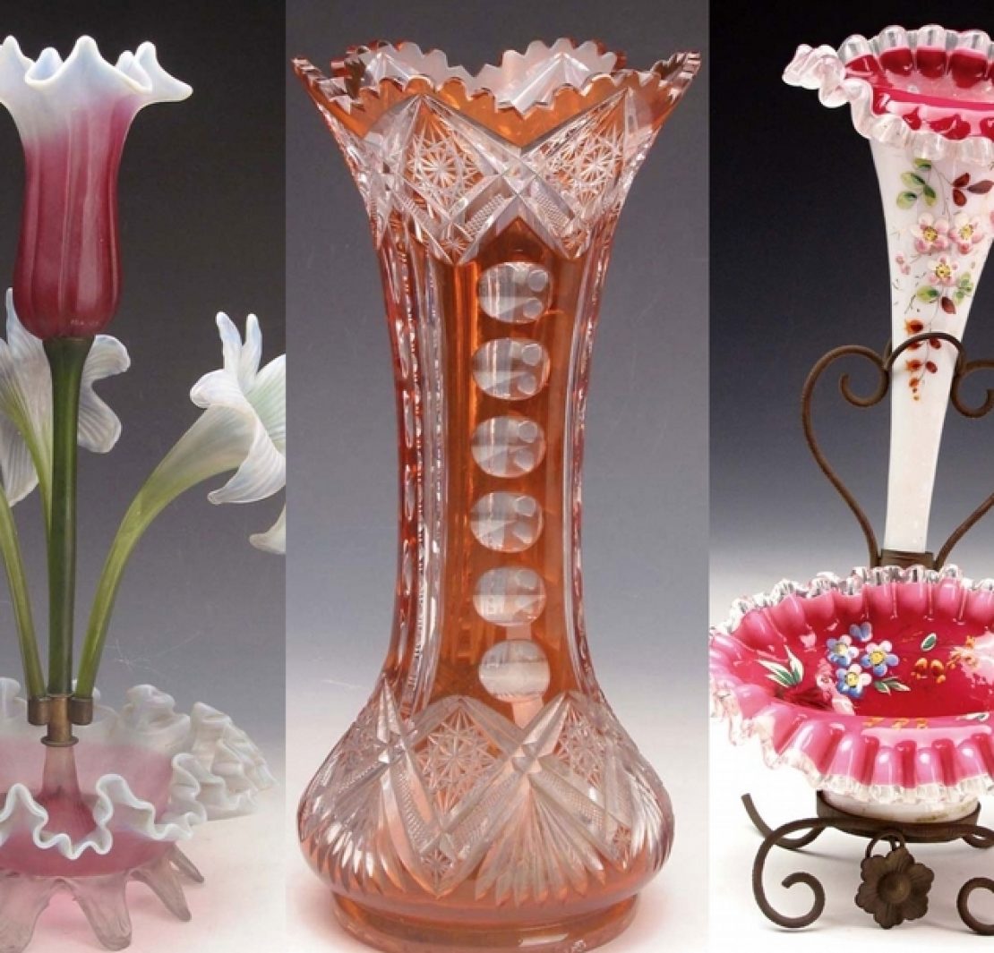 清宮藝術品。花插整體為喇叭花造型,主要由花插、底座兩部分組成,花插與底座的連接處有管狀銅插件。花插為四朵粉色喇叭花,中間插的花高而直挺,四周的插花略低且向外彎曲,花朵外均纏有綠色藤蔓,自然寫實,清新脫俗。底座呈荷葉形,底座口沿與花邊的摺邊均掐製而成,花朵及底盤均由內白外粉色不透明玻璃套接製成。此種造型非傳統造型,頗具歐洲文化氣息。