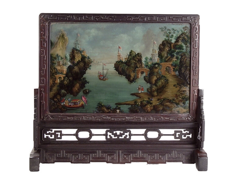 圖6 清〈紫檀邊座玻璃畫山水插屏〉