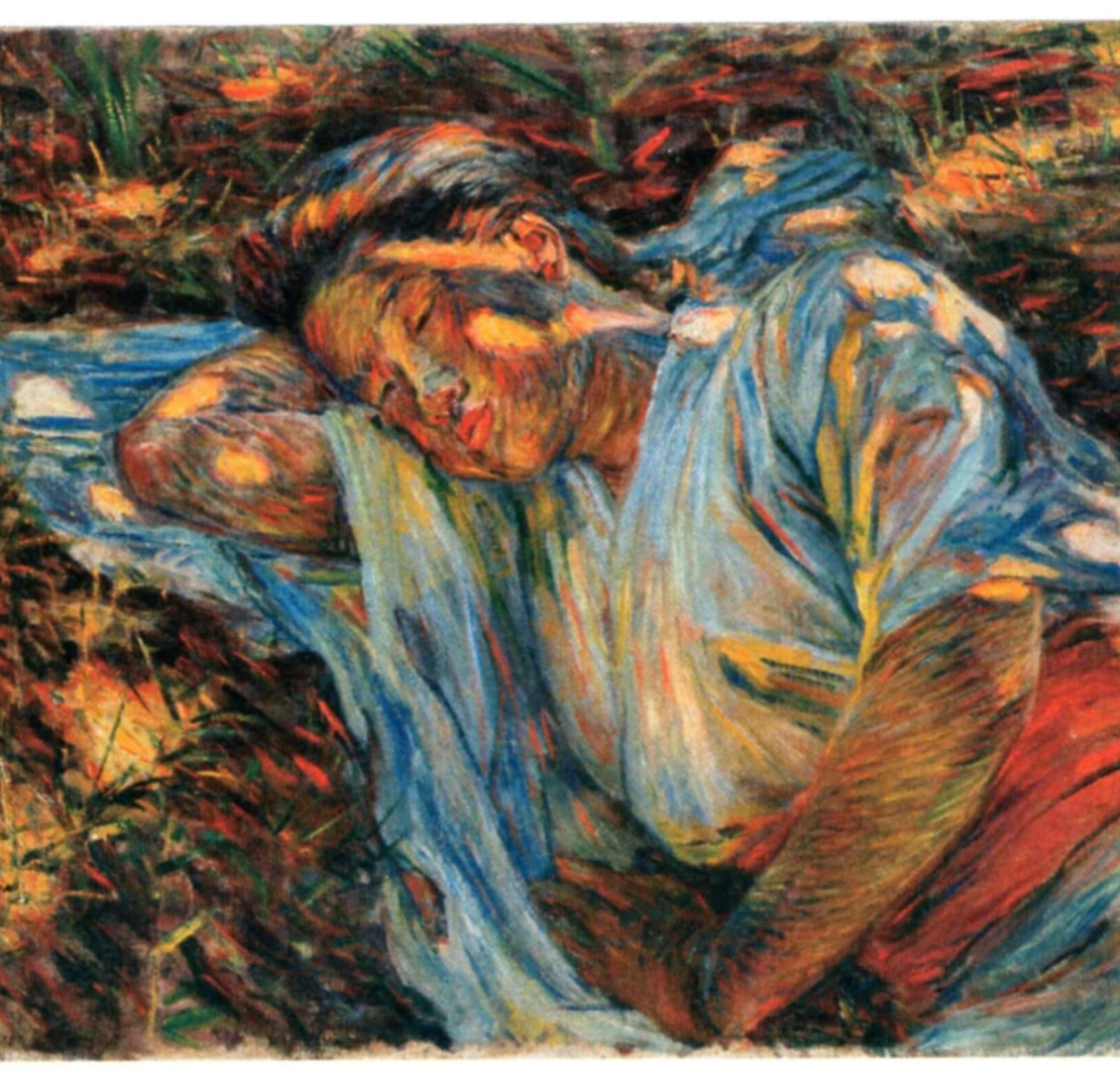 黑田自1890年起,即以楓丹白露的林間地帶為根據地進行創作,例如:其四季風景系列中的先驅之作《落葉》(圖1),即見以短筆觸描繪地面,並點綴綠意增添色彩對比,畫面中的筆觸與色彩,均清楚展現黑田試圖以印象派技法捕捉瞬間光影的努力。而在《摘草的婦女》(圖2)中,黑田並非單純描繪戶外自然風光,畫面中婦女彎腰採集野草的姿態,與周圍寧靜氛圍交相呼應,尤其在灰、綠色調的細膩運用下,整體色調沉穩柔和,呈現靜謐詩意的秋季鄉村風光。黑田返國後,仍繼續以印象派風格創作,《舞妓》(1893,東京國立博物館藏)與大膽運用分割筆觸的《午睡》(圖3)即為作例。