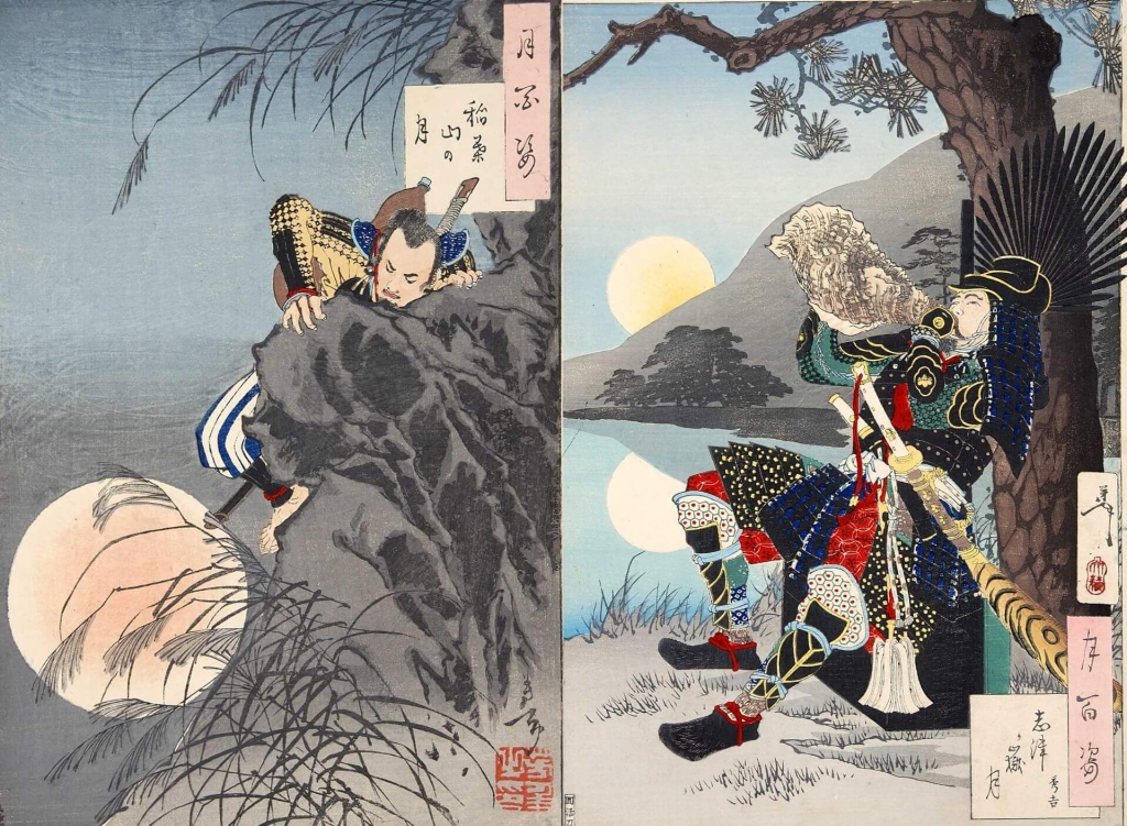 接著來看,《月百姿》中的歷史時刻。〈稻葉山之月〉描繪戰國時代織田信長(1534–1582)攻打稻葉山城的傳說。畫中攀崖的武士是蜂須賀又十郎(秀吉陣營),他背上的大葫蘆(瓢簞)才是畫面真正的主角。根據故事,木下藤吉郎(後來的豐臣秀吉)帶人夜襲城池,潛入後舉起葫蘆作為信號,引導信長軍裡應外合奪下城池。這只瓢簞後來演變成秀吉的軍旗「千成瓢簞」,成為他成功與權力的象徵。
