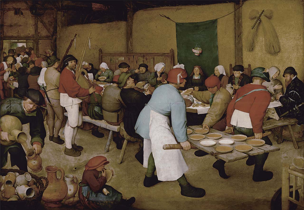 從經濟表現的角度上看,飲食具體地呈顯了左翼思想中最為批判的「階級意識」。大觀園內的料理工序,其汰除的食材只怕遠超過劉姥姥一家生養所需,更不必說抄家以後那「舉家食粥酒常賒」的慘澹生活了。而藝術作品中的宴飲,更鮮明地映射出階級的差異。南宋的《春宴圖卷》亦或者徽宗的《文會圖》,其明顯地投射出名流雅士那悠閒、愜意的生活美學;與此同時,《清明上河圖》裡的飲食則多半屬於市井人生的詩意寫照。同樣的場景放諸於西方藝術脈絡中,同樣可以看見老布魯格爾(Pieter the Elder Bruegel)的《農民的婚禮》(Peasant Wedding Painting)映照著鄉野尋常人家那趁著婚禮偷得浮生與大快朵頤的歡愉感,相較於此,哈爾斯(Frans Hals)的名作《1616年聖喬治民兵團軍官的宴會》(The Banquet of the Officers of the St George Militia Company in 1616)則更標誌著商業資本主義下新興階級的勝利。而雷諾瓦(Pierre-Auguste Renoir)的《遊船上的午宴》(Luncheon of the Boating Party)更精確地將消費社會裡的中產階級人生勾勒出來。