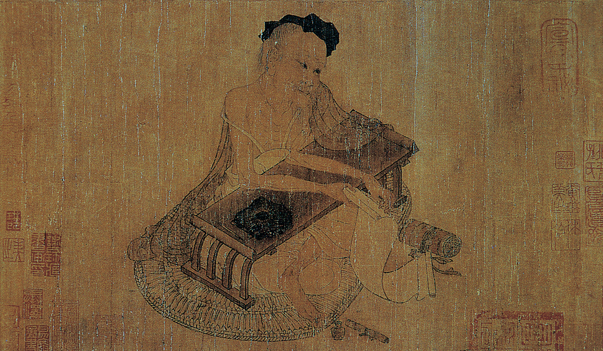 此件作品內容描繪秦朝博士伏生(伏勝)於秦始皇焚書坑儒之際,把《尚書》藏在壁中,直到漢代興起才將之取出,在齊魯之地講述《尚書》之學。雖然漢文帝欲招聘伏生至宮中講學,但他當時已高齡90多歲,遂將學問傳授予弟子鼂(晁)錯,本圖便是根據此一典故恭謹地描繪這位崇高學者形象的作品。由於畫中瘦勁線描承襲了唐代的畫法,因此相傳此畫乃是公認的古代文人畫始祖─唐代王維所作。畫上鈐有宋徽宗及宋高宗的內府收藏印,並有高宗題簽和南宋吳說的觀畫題跋等。