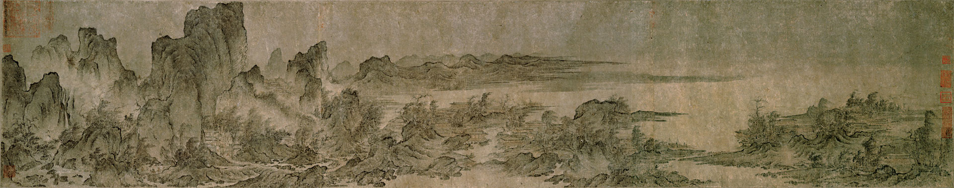此幅畫卷描繪了橫向水平展開的廣袤山水,從卷首處可遠遠眺望的江水,一直到卷尾仰之彌高的山體,真切表現了在風雨當中雲煙、樹木、以及水流逐漸變得激烈的場景,畫中多處還點繪有人們的生活情景。款題:「待詔□州筠□和縣主簿燕文貴□」。燕文貴為宋太宗朝宮廷畫家,其畫風融合了李成、范寬等人之北方樣式,和以董源(約活動於10世紀)為代表的南方樣式,並以細緻的筆觸描繪人物和樹石,被稱之為「燕家景致」。本圖可謂最具知名度且最能體現燕文貴畫風的傳世名品。