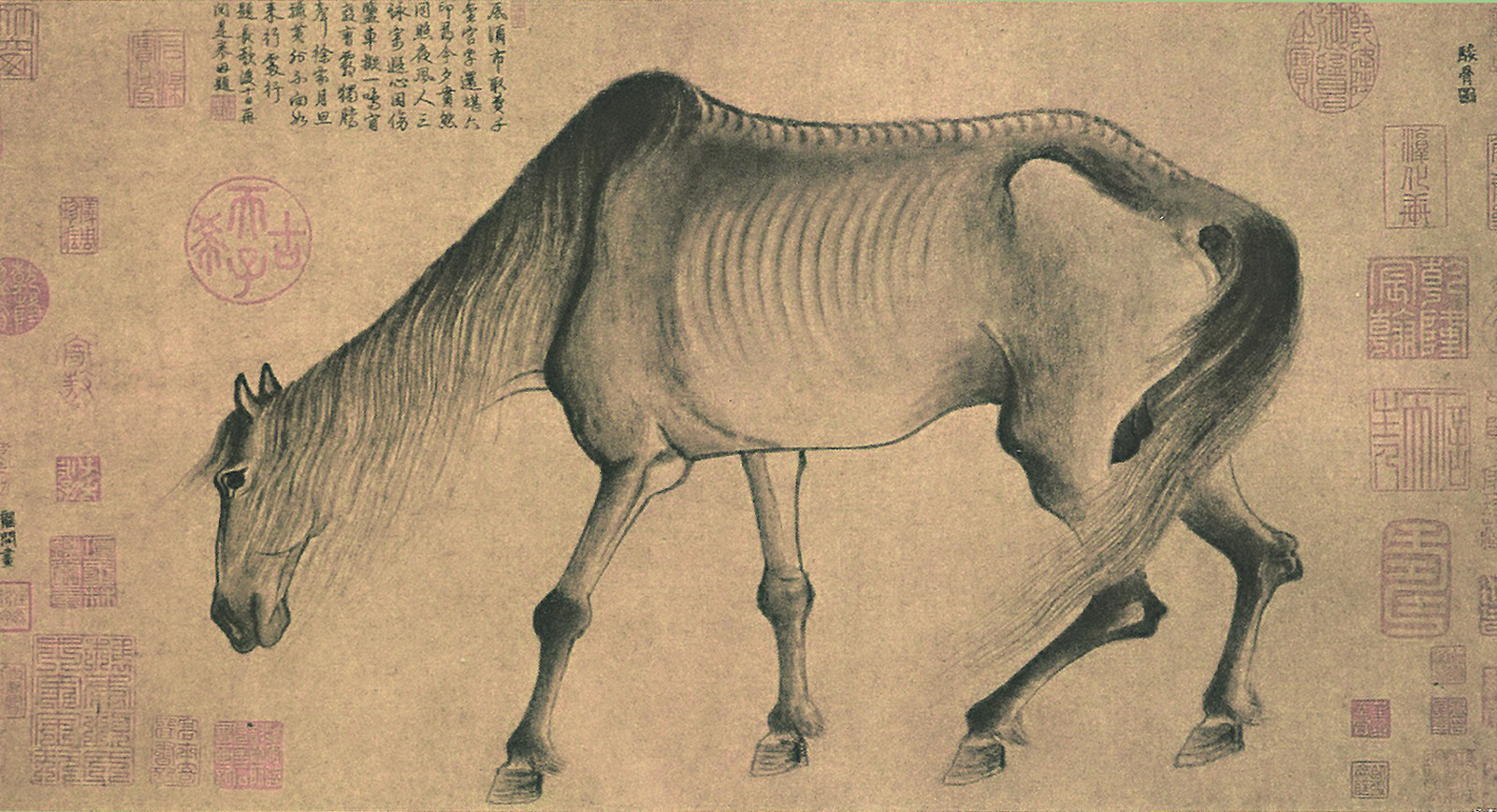 本幅為龔開所繪,其人於宋朝為官,入元後不仕,賣畫度日。圖中描繪一匹消瘦衰弱的馬兒,低著頭,鬃毛隨強風的吹拂而飄動,其身姿既可憐卻又帶有威嚴感。龔開在畫上的題畫詩寫到:仕於前朝的駿馬,如今雖然骨瘦如柴,無人憐惜,但相較於一般凡馬只有十多根肋骨,千里馬則擁有多達15根肋骨,且因為變瘦的關係,骨骼顯露於外,更突顯出其與凡馬之不同,故衰頹著實不是牠所忌諱在意之處。由此可知畫家將自身的境遇寄託在這匹馬上,傳達出對異族統治的反抗精神。