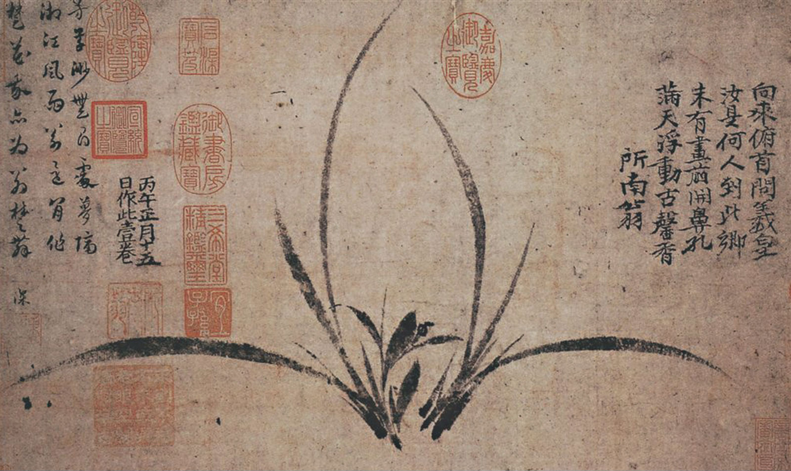 此圖作者鄭思肖於蒙元滅宋之際隱居蘇州,誓不與北人往來,且拒絕元代朝廷的招聘,貫徹對宋室的忠節;其名「思肖」亦為亡國後所改,含有思念宋代王室趙(肖)氏之意。鄭思肖擅長描繪被視為君子象徵的蘭花,但據說他因國土為異族占奪之故,畫蘭均不畫根。本幅是他傳世的唯一作品,同樣未畫出蘭根,刷以淡墨的蘭葉姿態既清廉又瀟灑。畫幅右上方的題畫詩和左側的落款均採用印刷的方式,似是按一定數量製作的作品。