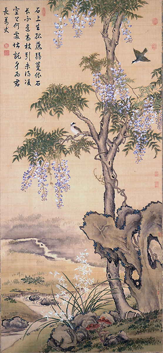 此畫為蔣廷錫所繪,他不僅是歷任戶部尚書、文華殿大學士、太子太傅等職的高官,亦是擅繪花鳥、在宮中從事作畫活動的翰林畫家。此圖描繪自榆木纏繞懸垂而下的藤蔓開花,在其上方有兩隻小鳥,下方溪水旁則點綴以色彩鮮豔的蘭花與靈芝等。畫幅上方有康熙皇帝御題。