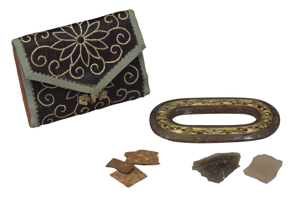 與香囊相似的,還有一類被稱為荷包之物,其功能為裝零星物品的小包,也被視為古代定情信物之一。其中最著名之例即為乾隆皇帝與富察皇后的故事。相傳,富察皇后曾親自繡了件《火鐮荷包》贈與乾隆,在皇后病故後,乾隆皇帝睹物思人,不僅為其特製漆盒、題識御製詩,並用錦袱包裹,裝入木匣之中層層保護,可見乾隆非常珍視這件荷包。