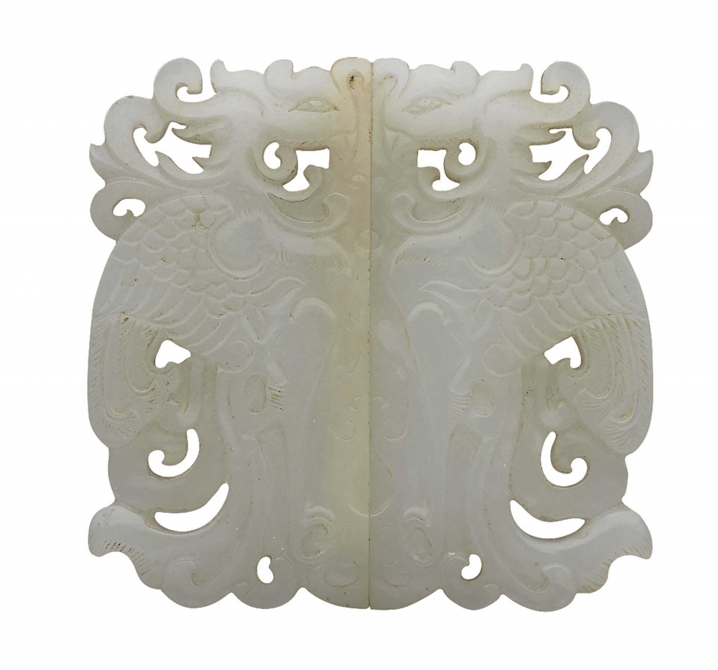 具有情愛之意的玉珮,如國立故宮博物院藏清《白玉雙鳳珮》,雕一組對稱鳳紋,全器呈片狀,中心製有滑軌,可分合為二。