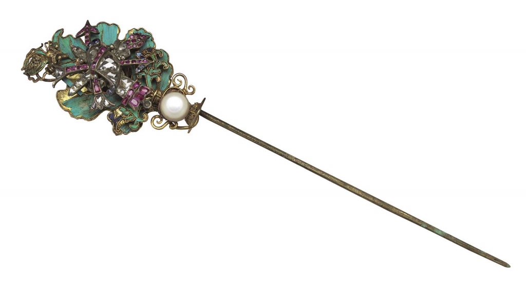 歷代遺留下來的髮簪樣式十分豐富,例如國立故宮博物院藏一件清乾隆時期《銅鍍金鑲西洋玻璃花簪》,簪首之飾可能與愛情題材有關。此件髮簪簪首飾一寶瓶,瓶身綴有珍珠,內插兩片小葉,並以一大片掌狀葉為底拖。底拖葉尖飾一蜘蛛,中心以箭形飾鑲嵌紅、藍、白各色玻璃。學者曾指出類似紋樣與騎士裝飾母題或許與神話中愛神邱比特的弓與箭有關,應該是取自西洋成品。
