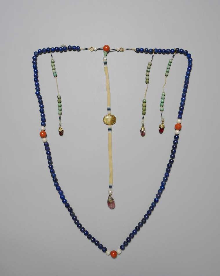 清代「皇帝朝珠用東珠一百有八……惟祀天以青金石為飾,祀地珠用蜜珀」。此掛朝珠藍色濃郁均勻,應是以阿富汗的頂級礦石製成,現藏於國立故宮博物院。(© 國立故宮博物院)