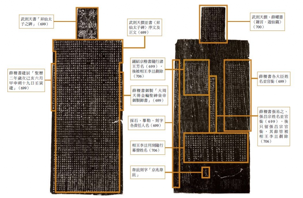 根據文末薛稷(649-713)所書建辰,該碑完成於聖曆二年(699)。當年在碑陰所刻的文字集中在上段,羅列了見證此次立碑隨行人員的姓名和官銜及刻石立碑的負責人。有趣的是,這份清單並非簡單羅列,而是清楚明白地分成三大塊:右方為政府高官、中間為「二張」張易之、張昌宗兄弟,而左方為皇族。在唐代,皇族擁有強大的政治實力,而不像在之後王朝中的皇族,儘管養尊處優,卻被架空了權力,難以撼動政權。至於「二張」是武則天的兩位男寵,在武則天統治晚期作為武則天權力的延伸權傾朝野。而且,「二張」還將昇仙太子的故事附會到自己身上,張昌宗就曾身披羽衣、乘木鶴吹簫來模仿王子晉,以加強自己在武周政權中的合法性。因此,《昇仙太子碑》的名單排列實際上就是武則天統治晚期權力結構的直接視覺呈現。