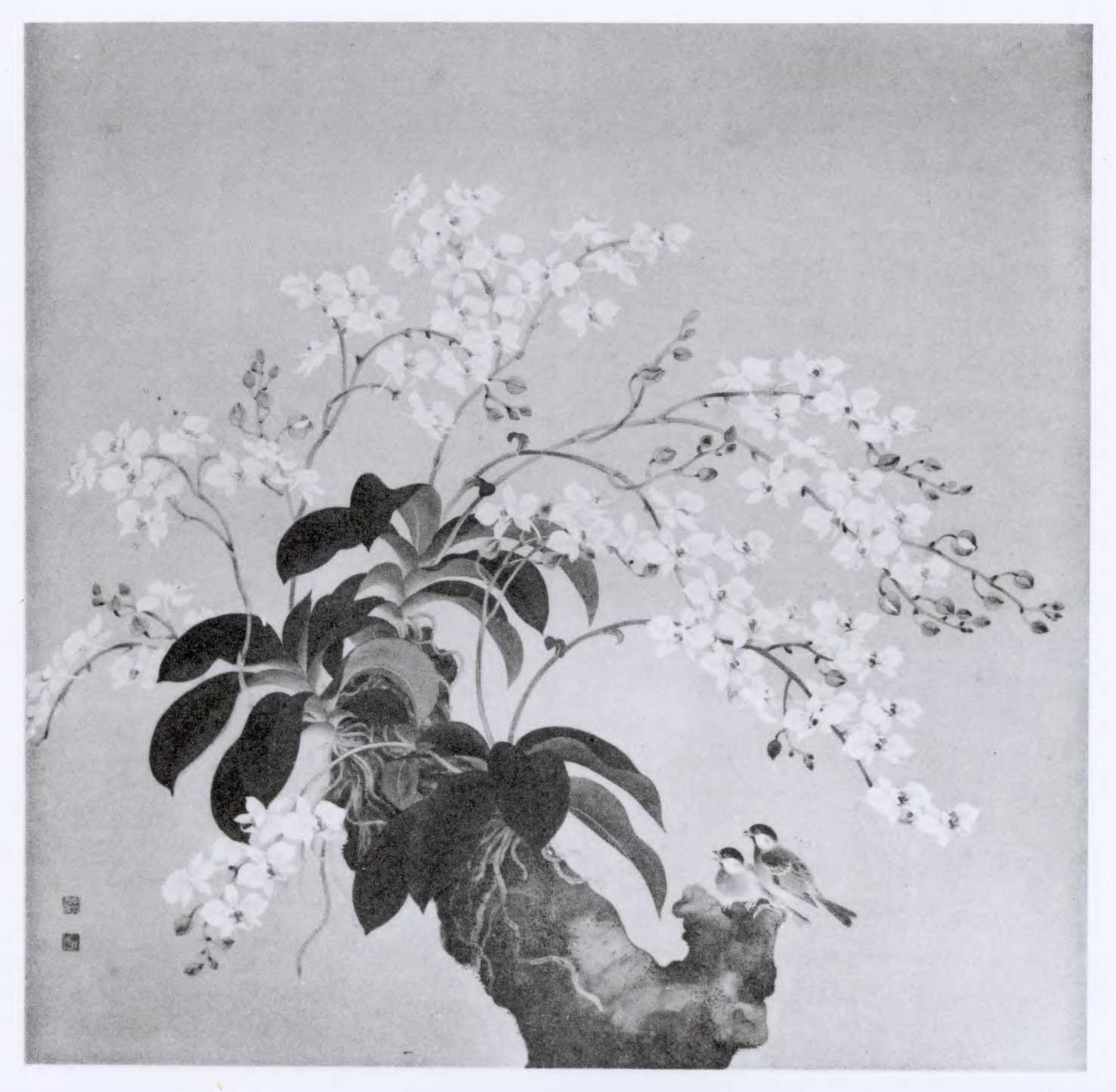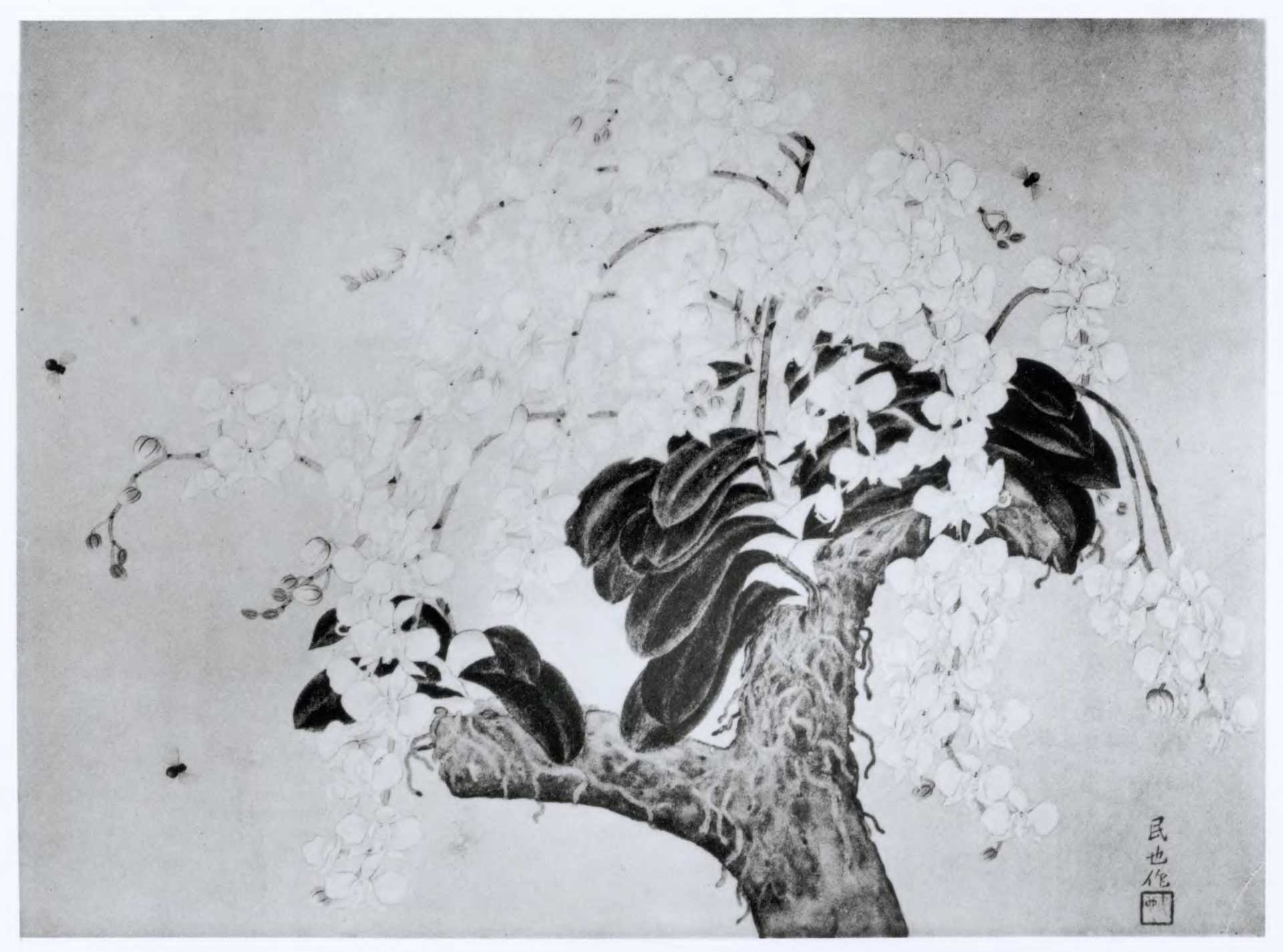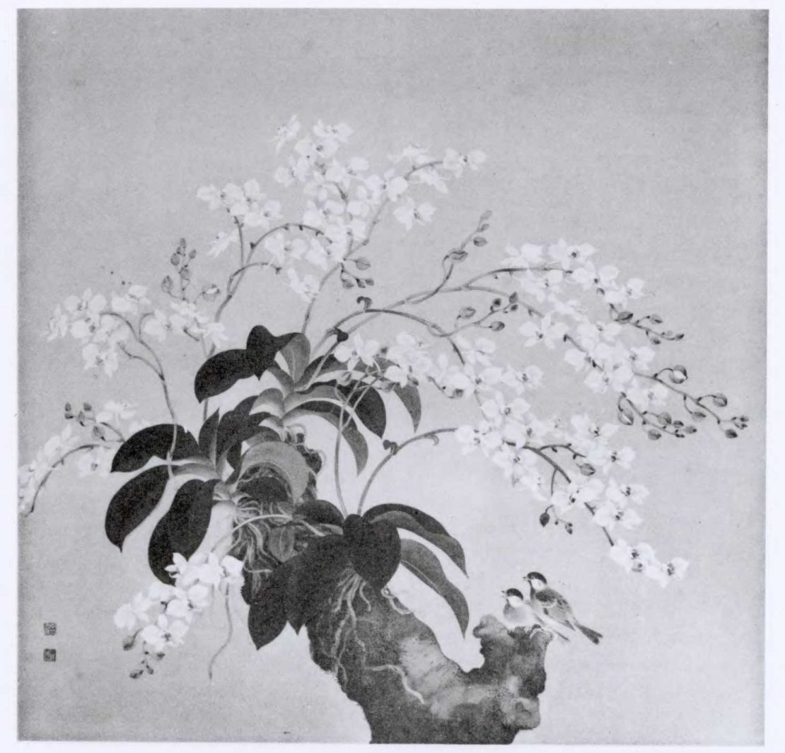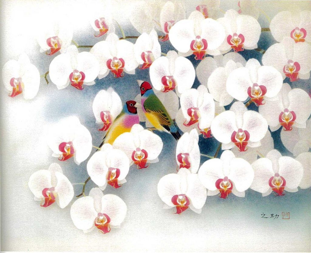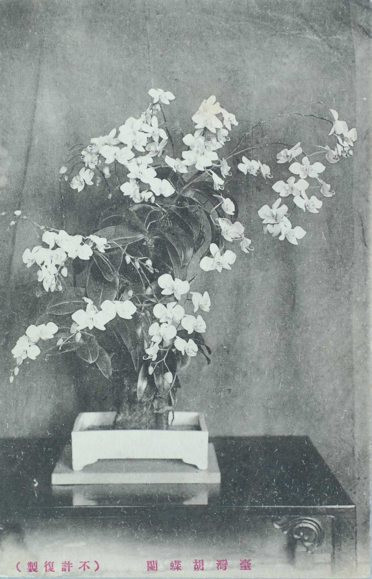 如陳進入選第6回台展的作品《芝蘭之香》,身著臺灣傳統嫁服的婦女端坐在螺鈿椅子上,畫面右側即擺放一大盆盛開的蝴蝶蘭。張李德和入選第2回府展的作品《蝴蝶蘭》,則直接作為主題,數株蝴蝶蘭附生在樹幹上,成串的花朵宛如蝴蝶一般沿著彎曲的花梗翩翩起舞,右下角還有兩隻雀鳥點綴畫面,呈現出極富臺灣南國特色的優雅景致。野田民也在第4回府展也以《蝴蝶蘭》為主題,一樣是碩大的蝴蝶蘭植株附生在樹幹上,成列的花朵迤邐翩躚。可以注意到,當時的蝴蝶蘭種植方式與今日有所不同,多半會讓蘭花附生在樹幹上,再固定於花盆之中,遠遠看起來就像是開滿花朵的盆景一般。日治時期所出版的「繪葉書」中有人工培植的蝴蝶蘭照片,其生長樣貌與畫家筆下的情境相似。