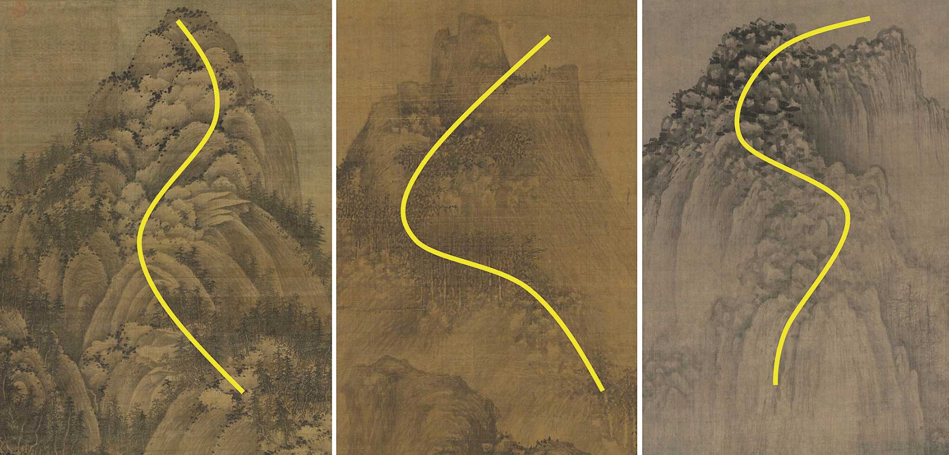 在《谿山行旅》、《早春》、《萬壑松風》這個序列中,可以看見主山所占構圖比例逐漸縮小,中景與前景逐漸擴大,畫中景象與觀眾的距離也逐漸拉近。至《萬壑松風》時,前景占最大比例,畫中視野縮小,畫幅高度降低,遠景主山也失去昔日威嚴。