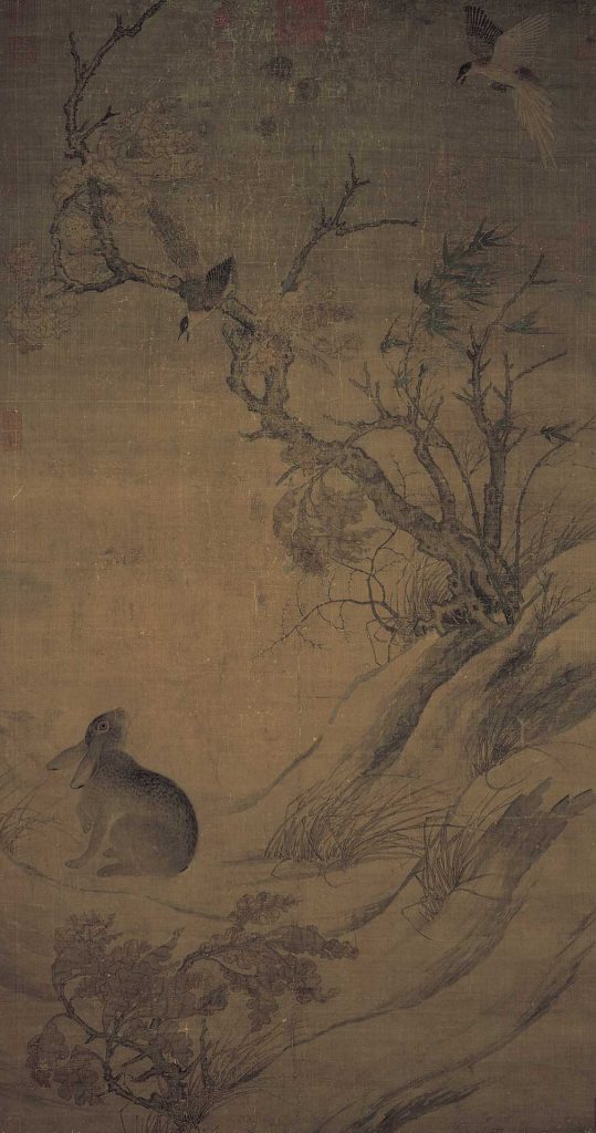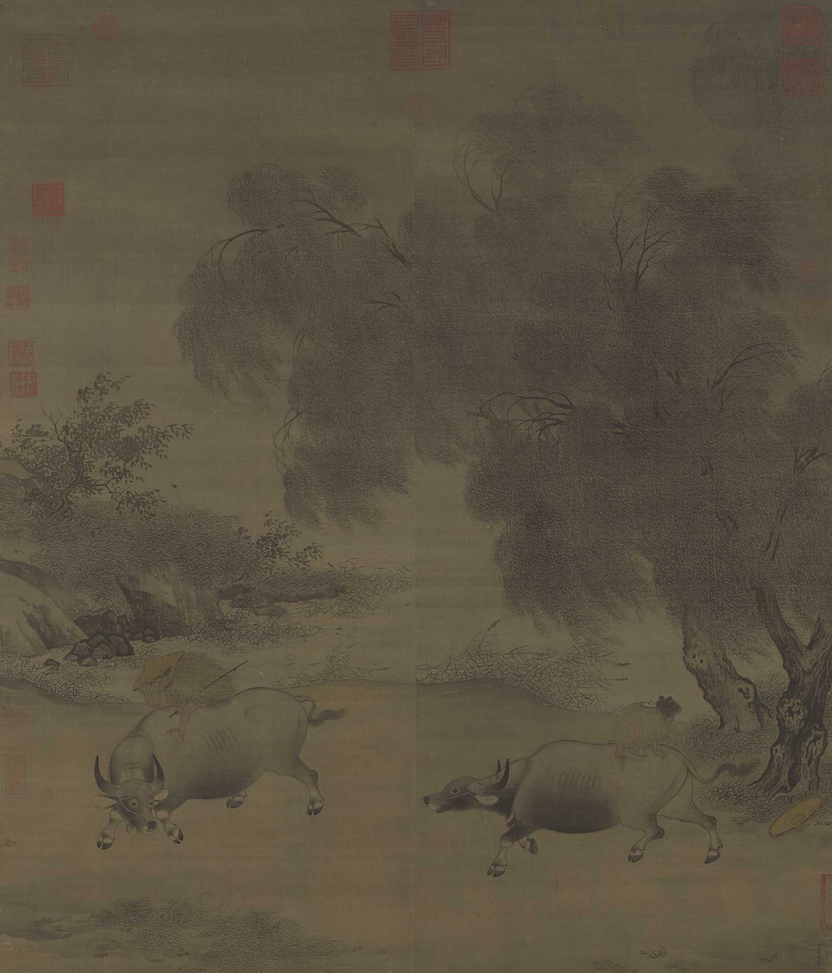 按本幅確實畫了「萬壑松」。問題是,「風」從哪裡來?怎知有「松濤」?以南宋馬麟畫、理宗題《靜聽松風》為例,畫中以人物姿勢、松針、藤蘿的飄動表現風向與風勢。李迪1174年作《風雨歸牧》,畫彎腰壓低斗笠和急著撿拾斗笠的牧童,又畫各種植物的葉尖翻飛,足見風勢又大又急,故理宗題「冒雨衝風兩牧兒」。1061年崔白《雙喜圖》,畫植物葉片朝畫面右側翻飛,枯枝也向右上彎折。金代武元直《赤壁圖》,前景松樹枝幹、松針往右側彎折,顯示江岸大風。總之,以上傑作都利用各種方向一致的動態感來表現風,唯獨《萬壑松風》的松枝、松葉層層疊疊、密而不亂,卻沒有方向一致的動感。