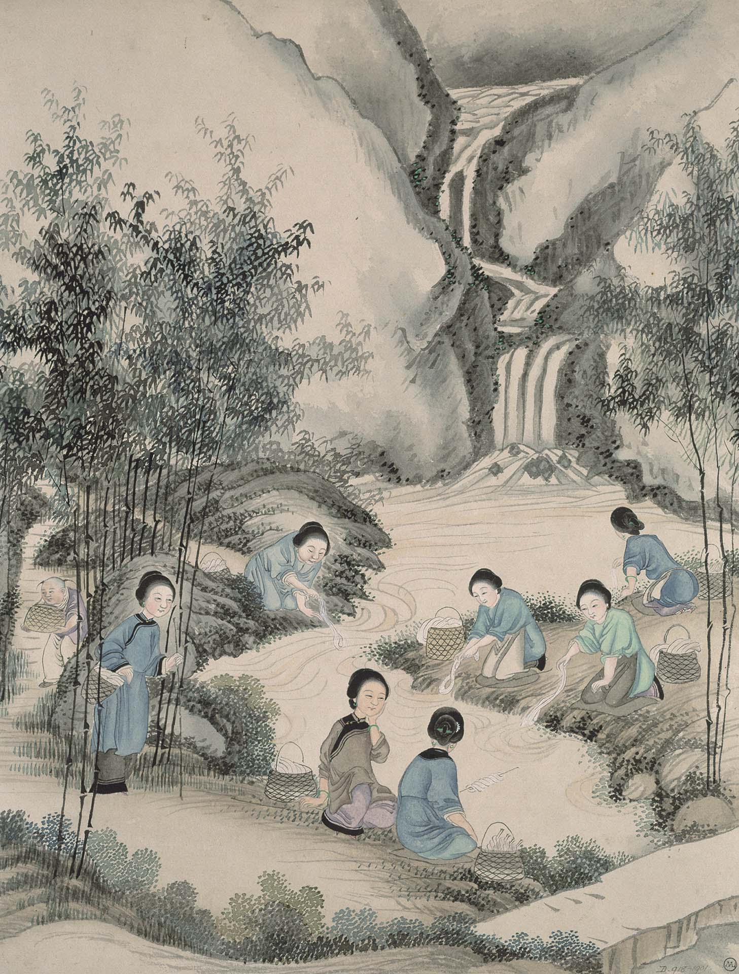 此處所見頁面,即是描繪婦人在溪邊浣絲的場景。在畫冊最後一頁的小紙片上曾發現作坊及畫師訊息,內容為:「粵東省城曉珠里英泰吳俊畫印」。曉珠里即今日廣東市楊巷路北段,估計英泰是專做洋人生意的店鋪名稱,然關於吳俊的生平事蹟卻無法知曉,有待日後進一步的研究。