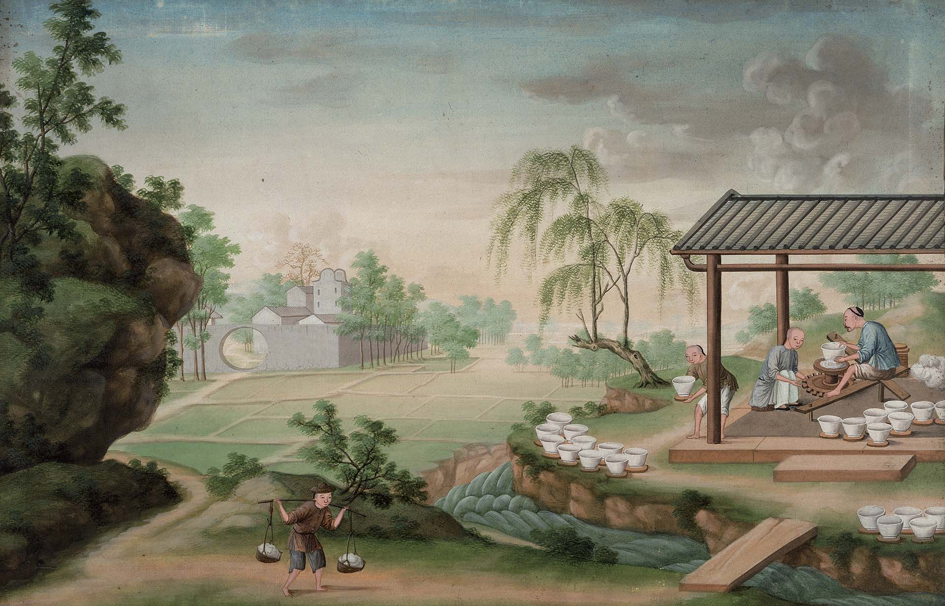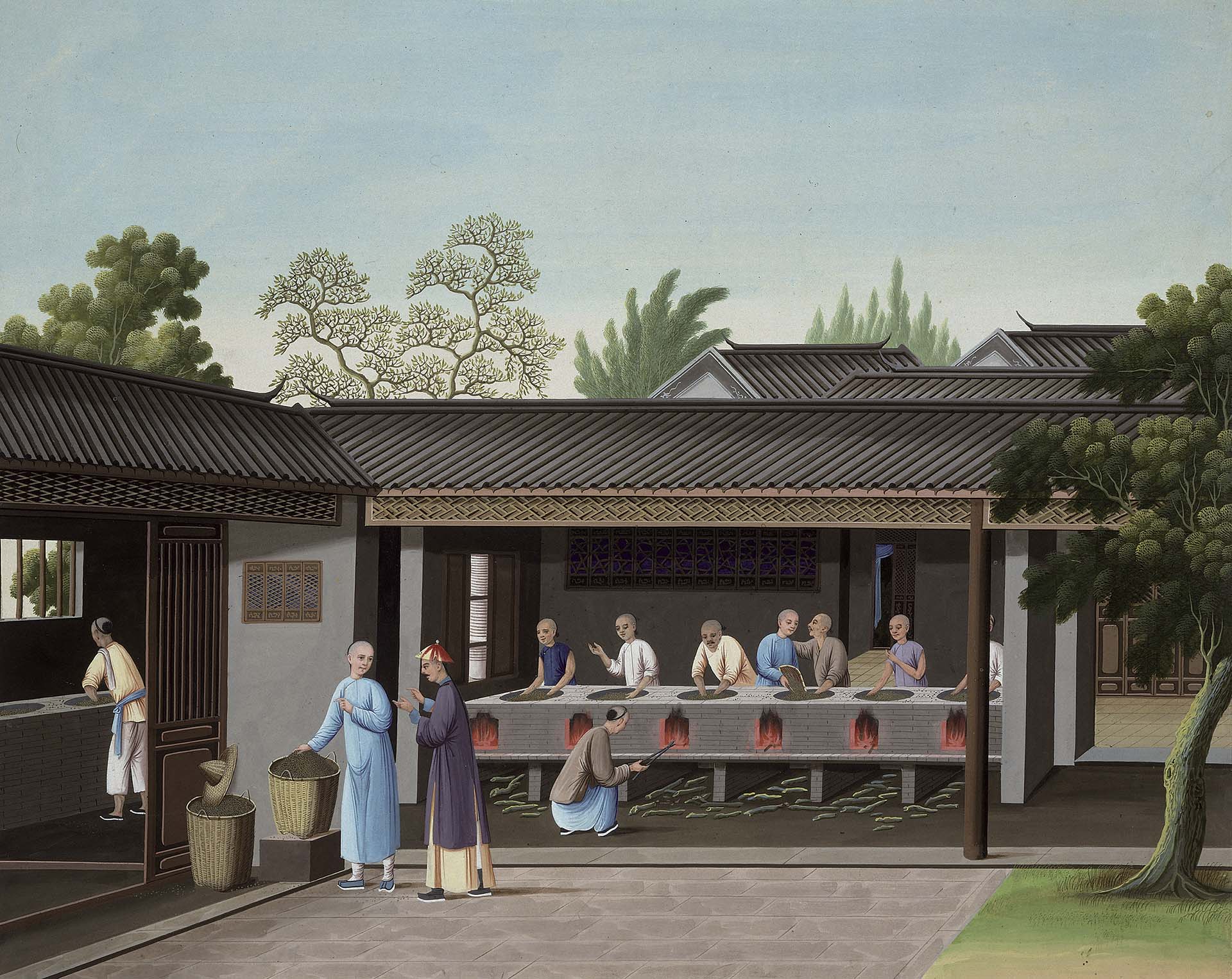 17世紀時洋人開始接觸茶葉,對茶葉種植和烘焙製造也產生濃厚興趣。透過圖繪了解茶葉生產與銷售過程,比起文字描述更為直觀,因此在館藏《製茶》組圖中,便可見到關於茶葉栽培、加工和銷售等活動。畫師根據個人在本地茶園獲得的知識和觀感,進而加以繪製。此處所見〈炒青〉步驟,說明茶葉萎凋之後,須把茶葉置於密室內存放,待其發酵,然後再進行炒焙,這是紅茶製作過程的一道工序。整套畫作多著墨於生產部分,藉之明示茶葉種植和加工過程的細節。