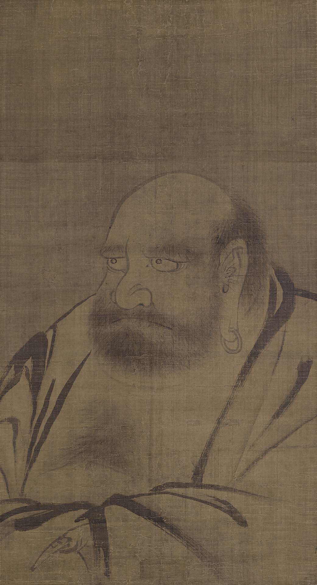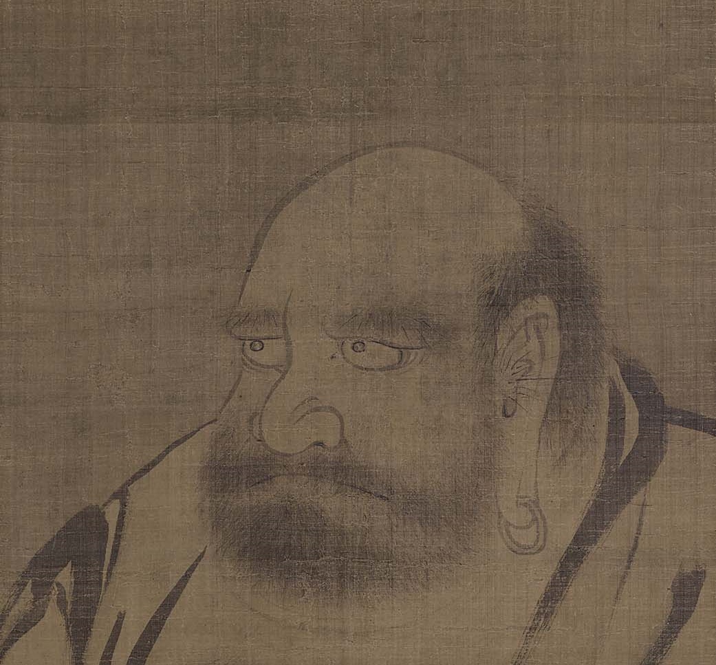 禪宗最初始於印度,傳說釋迦牟尼佛在靈山會說法,手拈鮮花示眾,沒多作說明,眾人不解其意,只有摩訶迦葉領略禪意,露出笑顏,於是佛陀將心法傳予迦葉,迦葉因此被視為禪宗初祖。禪宗在印度傳法28代,到了菩提達摩始東傳中國。菩提達摩簡稱達摩,傳說他是南天竺或波斯人,大約在劉宋(420-479)末年抵達中國南方,展開在中土的傳教,被尊為中國禪宗初祖,也成為禪藝術中代表性的人物。來自西天的達摩,有著與漢人迥然不同的面目,通常被描繪成五官深邃、面蓄虯髯、體毛茂密,打扮則穿耳環、身披長袍,以鮮明的梵僧形象深植人心。本次展出的《達摩像》即為典型的達摩形象,眉骨突出,雙眼大而圓,緊抿嘴唇,神情嚴肅。《達摩像》沒有落款,收藏外盒標註作者為南宋高僧無準師範(1179-1249),觀其風格,全作以深淺墨色繪成,面部描繪較為仔細,衣紋則刻意使用粗獷、帶有飛白的筆觸,應是受南宋禪宗繪畫影響的作品。