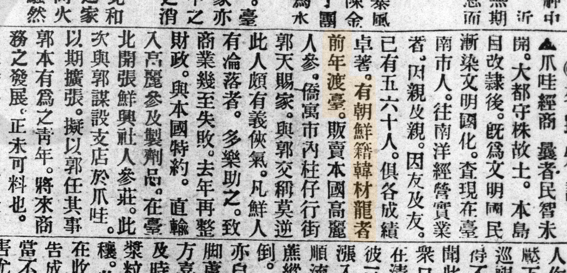 除了陳英聲的朝鮮描繪與其傳世作品,我們自然也好奇當時朝鮮人的台灣經驗,而先前提到的朝鮮記者朴潤元,他曾發表的新聞文章或觀察評論中,事實上也描述了當時在台朝鮮人的狀況,以及他對台灣原住民的觀察。根據其發表在《東亞日報》的文章「在台灣居住的朝鮮同胞現況」 ,朝鮮人移居台灣的現象在日治時期之前就已經存在,希望能夠脫離貧窮的生活在豐饒富庶的南方如台灣或東南亞一帶,得到更好的生活。當時朝鮮人要在海外致富的重要關鍵,想必就是半島產的珍貴人參,特別是當時在台灣能大發利市的朝鮮商人,大多掌握其通往台灣、東南亞或中國的販售通道。其中最有名的則是經營興鮮社,出身自義州的韓材龍,他與台灣商人郭天賜合作,取得朝鮮人參的進口權,甚至在爪哇也設有分店,商譽遠播。而興鮮社在當時因為韓材龍樂善好施,常因同鄉情誼幫助有困難的在台朝鮮人,據朴潤元的說法,在當時可謂是台灣朝鮮人的交流甚至收容中心。