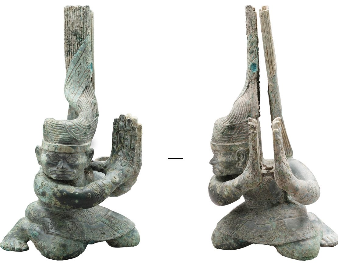 而新發現的6處埋藏坑中,又陸續出現之前從未發現的新器物,比如3號坑中出土跪坐的青銅人像頭頂著似「尊」的器物。4號坑則出土「扭頭跪坐人像」,開腳蹲跪的人像表情嚴肅,兩手置於臉的左方,頭上的髮型呈現盤髮收束的模樣向上延伸,如果從側面看,可以看到人像出現一個缺口,連同兩手之間留出的空隙,像是可以放入某種扁平物品的卡槽。像這樣器物的出土,似乎可以更明顯感受到是祭祀時期的宗教禮器,只是實際上的用途為何,與之前1、2號坑出土的文物有多少關聯性,是否可以讓古蜀文明的面貌更為清晰,尚待完整的調查報告出爐與後續的研究。