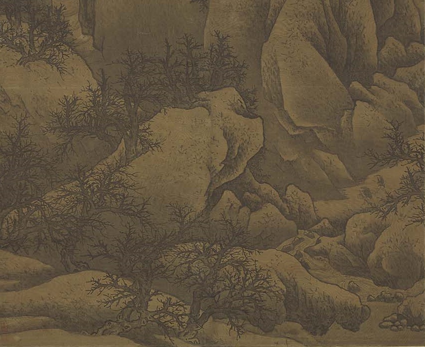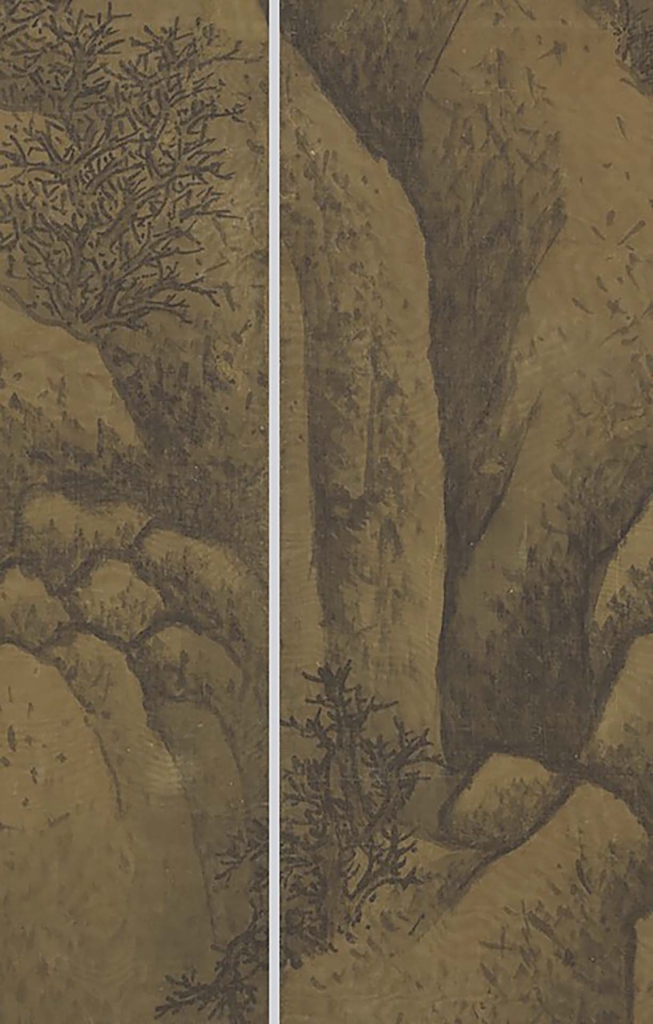 想當然的,畫家在創作時,就算畫面由好幾幅絹拼接而成,他也會盡力避免拼接的痕跡。問題是,當絹老了,必須重修裱褙的時候,除了如前所述,絹的邊緣絹絲易脫落,那拼接的位置也一樣。所幸因為它們在畫的中央,不像在畫面邊緣容易摩擦損傷,所以經過小心揭裱,通常損失有限。正因此,無論〈谿山行旅圖〉、〈雪景寒林圖〉、郭熙〈早春圖〉、李唐〈萬壑松風圖〉,雖然看得出拼接的痕跡,卻不太見得出其中的損傷。