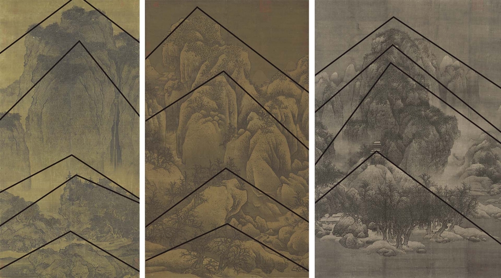 如果認定〈谿山行旅圖〉為范寬原作,作為鑑定的「樣板基準」,我們就得從各方面將〈雪景寒林圖〉、〈雪山蕭寺圖〉與〈谿山行旅圖〉作比較,看看三張畫在「造境」、「構圖」、「皴法」上有多少相似之處?