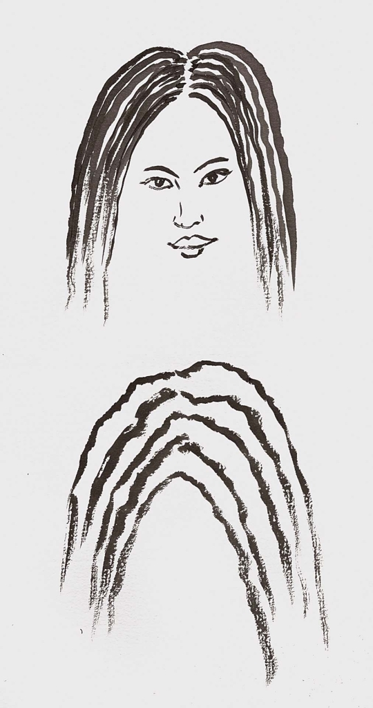 對於不從事山水畫創作的人,或許不易瞭解,讓我進一步解說:當我們畫山巒的時候,如果是圓頭山,很容易畫成女孩「長髮披頭」的樣子,也就是一縷一縷從山峰的中軸線往兩邊垂下。
