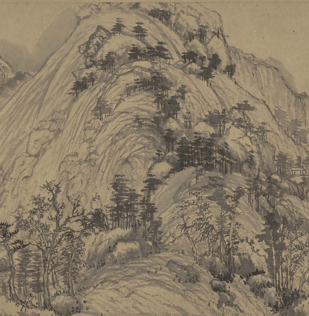 加上那鬆茸的許多乾點子,點與點之間也透氣,是不是給人一種遠看大山大水,中間似乎隔一層空氣的感覺?也可以說,當絕大多數畫家之水墨濃淡表現遠近的時候,范寬用了另一種方法:水墨點描!