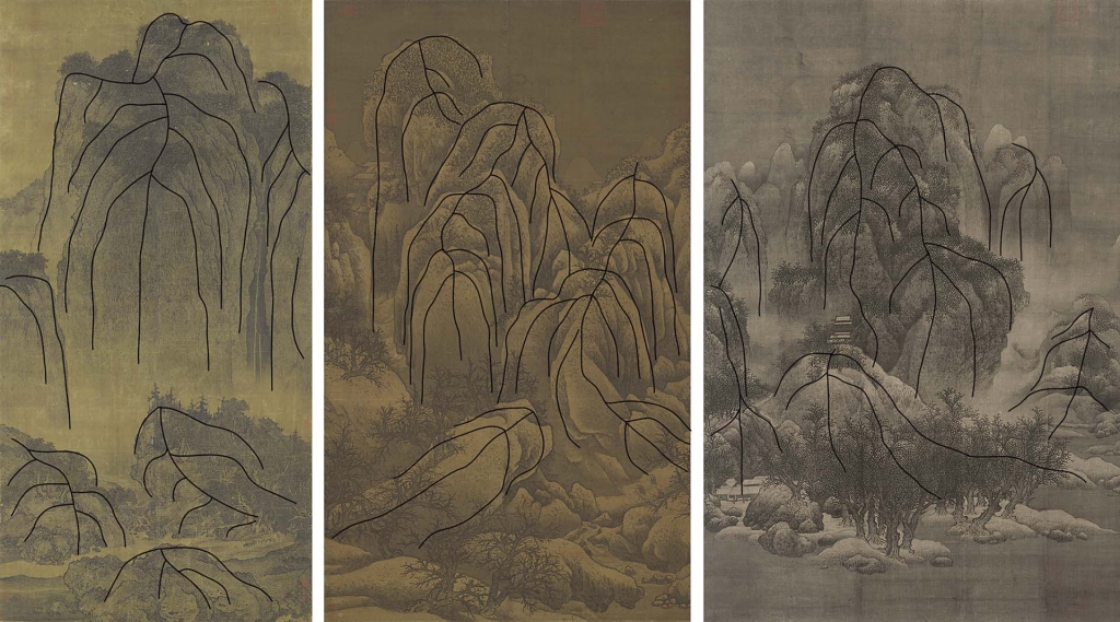 再看看〈雪景寒林圖〉和〈雪山蕭寺圖〉也一樣,山頭都畫滿筆法簡約的寒林。作者除了用這方法緩解死板的問題,更不斷把山的「軸線」(或稱山脊)向下分支,每一支再形成個較小的山脈。他還用了個方法,是把「軸線」扭動,產生「搖擺變化」的效果(圖17)。這三張畫上搖擺變化的位置極類似,在亭亭眾山間作個扭動,仿佛「眾人皆醉我獨醒」,整幅畫都因此生動起來。