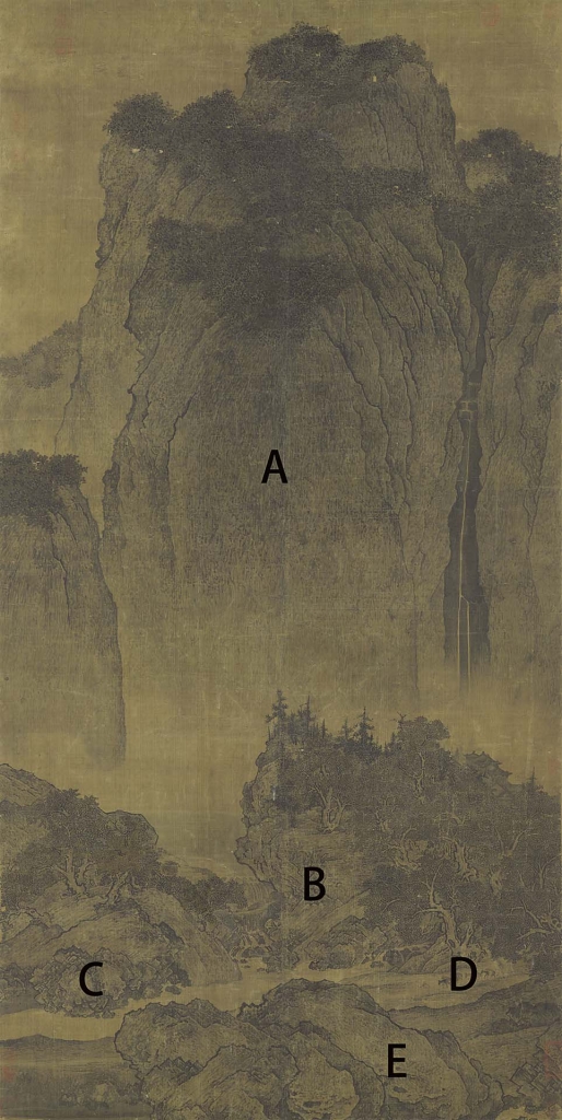凡此種種形容,都與這「鼎足三作」相合,而且因為描繪地形地勢的不同,范寬對那許多小點子的用法,還大有講究:譬如〈谿山行旅圖〉後面的主山,因為幾乎是垂直的立面,他用很平均的乾筆點子描繪(圖18A)。中景瀑布兩邊的大片岩石塊面,他用很長的皴筆,以將近45度角「斜擦」(圖18B),至於水邊,因為受水氣,色較深,又受侵蝕形成小塊裂,他則用比較實在,甚至有點「小斧」、「馬牙」皴的方法(圖18C)。輪廓線也特別用中鋒濃墨,畫得剛硬。溪邊平緩的土坡以稍柔和的「散麻皴」線條形容(圖18D)。甚至在最近景,加上些受雨水侵蝕形成的小凹洞(圖18E)。也可以說范寬的皴法非常靈活,所謂「對景造意,寫山真骨」,他用哪種皴法沒有一定,完全看描繪的對象而定。