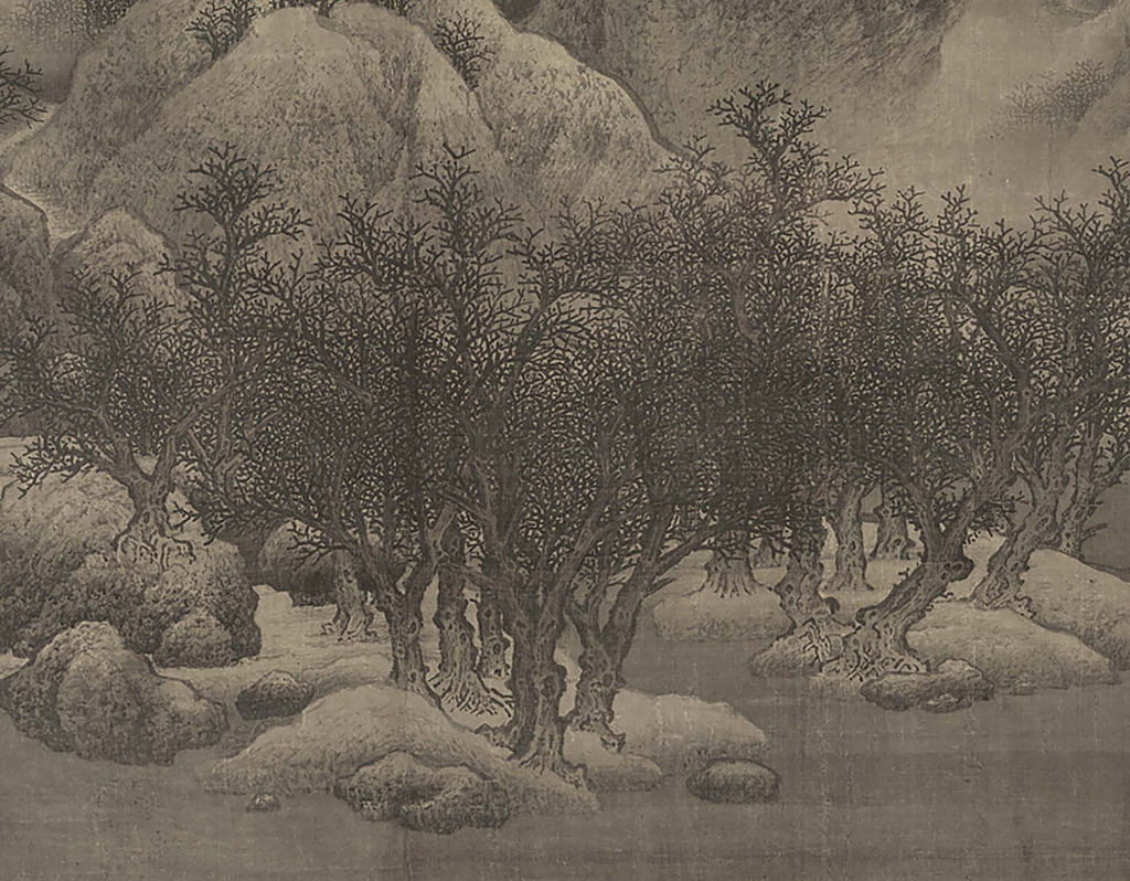 這張畫上尤其值得注意的是前景的寒林,如果不細看,觀者一定認為是實景寫生,但要知道如果真是寫生,一層層的寒林,從側面看過去,樹枝一定會有許多重疊處。可是請細看這張畫,用濃墨畫的樹枝,完全沒有重疊的地方,作者顯然是很小心地編織了一張通透的網子(圖19),讓人想到當今的日本抽象畫家草間彌生。可以說在北宋那個寫實山水的時代,這幅畫表面寫真,其實已經不囿於物形。