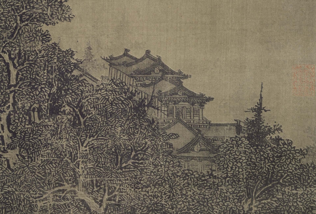 至於〈雪山蕭寺圖〉,既因尺幅受損較多,影響了整體氣勢,也可能由於淡墨皴擦,若不細看,便看不出。加上受世人推崇的〈谿山行旅圖〉在側,萬丈光芒吸引了大部分人的注意力,在臺北故宮似乎也較不受重視。