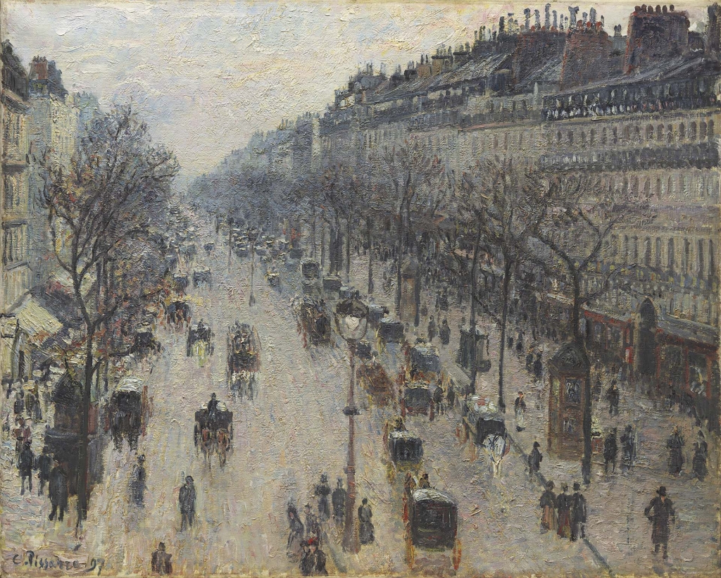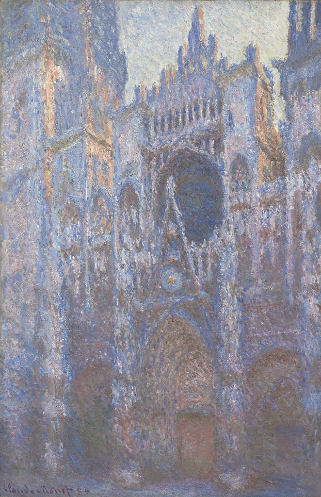 但是綜合前面的分析,從造境、構圖、山巒佈置、岩石切割和皴法用筆一一比對,〈谿山行旅圖〉、〈雪景寒林圖〉、〈雪山蕭寺圖〉這三幅畫都極為相似,而且如徐悲鴻所說「大氣磅礡,沉雄高古,誠辟易萬人之作」。非但三張畫有同樣高妙的表現,而且縱觀整個中國美術史,在而今可見的作品中,都很難找到與范寬成就相當的。非但結構素描陰陽明晦、地形地理的掌握難望其項背,更幾乎找不到哪位畫家能參透范寬「水墨點描」的三昧。在西方畫家畢沙羅(Camille Pissarro,1830-1903)和莫內(Oscar- Claude Monet,1840-1926),以點描畫法表現光影印象之前近900年(圖22、23),范寬早以看似寫實的點狀皴法和網狀的寒林畫法表現光影迷離、虛實跳動的空氣氛圍。