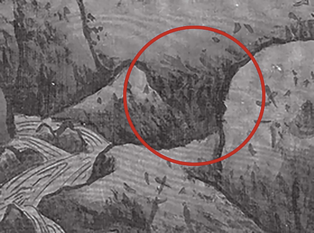 現在好戲上場了!我們乍看〈雪山蕭寺圖〉似乎也完美無缺,但是細看卻能發現在中線拼接的地方,許多皴筆和景物不相連。局部放大就更明顯了,推測其間損失了最少一公分,甚至可能多達三公分。也就是如果把左右兩幅絹拉開一段距離,會感覺畫面更完整(圖7)。