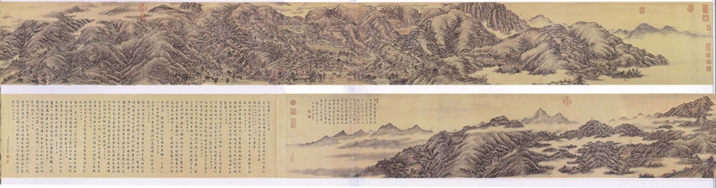 董邦達為乾隆朝詞臣畫家,在起伏的山巒間,畫家將盤山十六景錯落縮寫於畫卷中,並標注景點名。整幅畫卷山勢宏偉、建築精細,滿山花樹盛開,局部圖由下而上可見清代皇家園林靜寄山莊與四面芙蓉、太古雲嵐、清虛玉宇、層岩飛翠等建築。畫尾天空處有乾隆御筆題寫〈盤山花朝近作〉詩一首,首四句「常年每愛度花朝,卻每花朝愁裡度;近喜薄雪灑原田,舉趾春耕猶不誤」,表達了他在花朝日踏青賞花時,亦不忘關心農事。