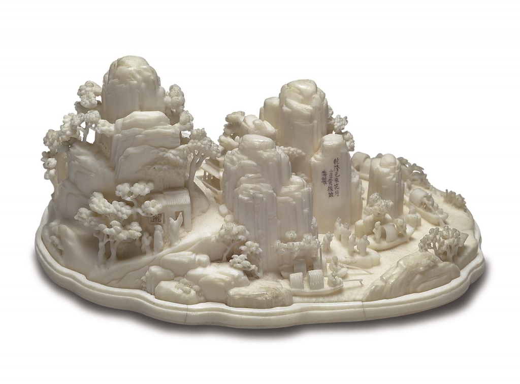 象牙雕成的立體山水人物小景,山勢陡峭,亭臺樓閣、茂密樹叢錯落;沿著水岸,蘆荻叢生,有小舟或泊或泛。表現春暖花開,眾人偕伴出遊踏青的滿山春色。山石上填黑陰刻「乾隆己未花月,小臣黃振效恭製。」係乾隆四年(1739)二月,清宮造辦處之廣東牙雕匠黃振效製作。
