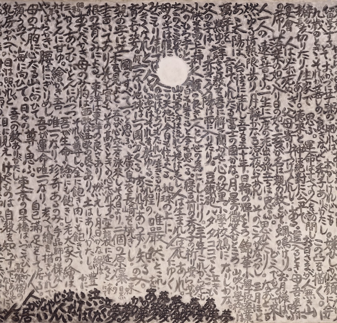 而在這次「在夾縫中行走」中,最受矚目的何德來作品,想必是《五十五首歌》。在這件作品當中,他以多首短歌,以錯落交織的方式密布於畫面當中,墨色濃淡相疊,形成影子般的立體感。現場另備有一張將不同短歌區分出的示意圖,劃分出的紅線忠實呈現出這幅畫作的「夾縫感」。這些短歌都是何德來親自創作,也是他用來表達自己生命經驗重要的媒介之一,曾在1974年出版《我的路》(僕の道)一書中收錄,後於2001年由作家陳千武翻譯於台灣出版發行。在這部為了紀念過世妻子的詩文集中,他娓娓道來了自己的生命經驗,從親生父母送養到被養父母送至日本唸書,再到與妻子的相遇等等,忠實紀錄了自己的人生。而在畫作當中,不同首詩歌的間隙,彷彿著不同人生階段的斷點與際遇,雖然在畫作中看不到,不過卻默默地存在著這些聯繫著各種交界點的能量,令人印象深刻,也與策展主題緊緊相扣。另外展出的《死谷》與《今年》據展場說明指出,為何德來手握兩隻筆,分別以濃墨與淡墨書寫,造成肌理層次上的疊影效果,明確描繪出實體和影子的對應,彷彿透過簡單的手法處理且傳達出多重宇宙的時間重疊意涵。