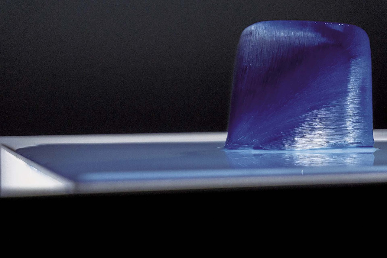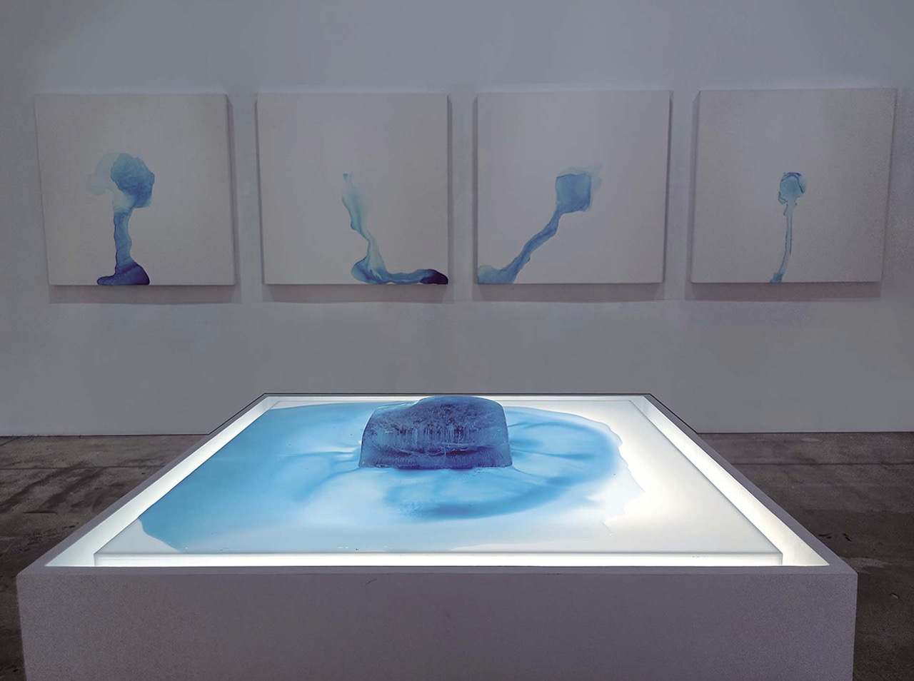 藝術家的系列作品「非恆態」在凝然的藍色染料冰塊中,讓我們看見了染料分子的分佈回應著熱力學的分子運動模式。而其受到溫度與重力牽引而緩緩滴落的藍色水滴,在紙上以自有的秩序暈染著,整個作品的過程真正作用的僅僅是不可見能量的耗散過程,卻又以可見的痕跡昭示於觀者眼前。恰是「熵」讓「時間」成為無不可逆的物理量(此所以科幻電影《天能》將時光倒流描述為反熵的過程),而藝術家通過顯形「熵」的作用性讓「時間」成為了審美的對象。